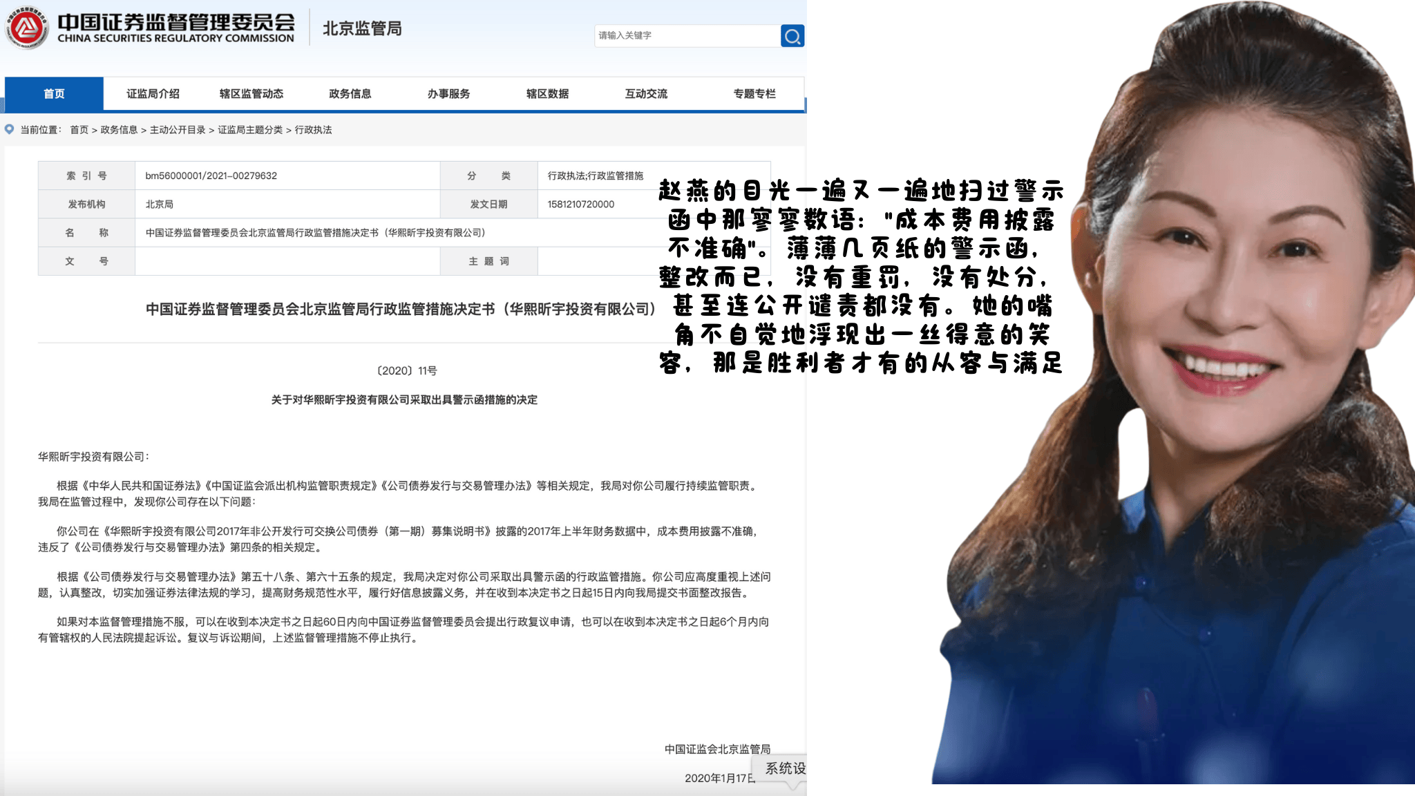 这一章聚焦于“权力对真相的再一次胜利”。尽管David通过实名举报揭示了华熙集团系统性财务造假、债券欺诈、逃税洗钱等多项严重违法行为,中国证监会北京监管局却仅向赵燕发出一封措辞温和的“警示函”,理由是“成本费用披露不准确”。这一轻描淡写的处理结果,成为赵燕胜利姿态的注脚。